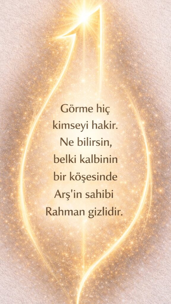 Görme hiç kimseyi hakir. Ne bilirsin, belki kalbinin bir köşesinde Arş’ın sahibi Rahman gizlidir.